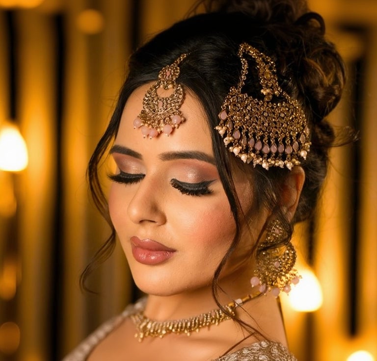 This package includes full makeup and hair for engagement or pre-wedding events, with mink lashes, jewelry setting, and dupatta setting. Service time is up to 2 hours.